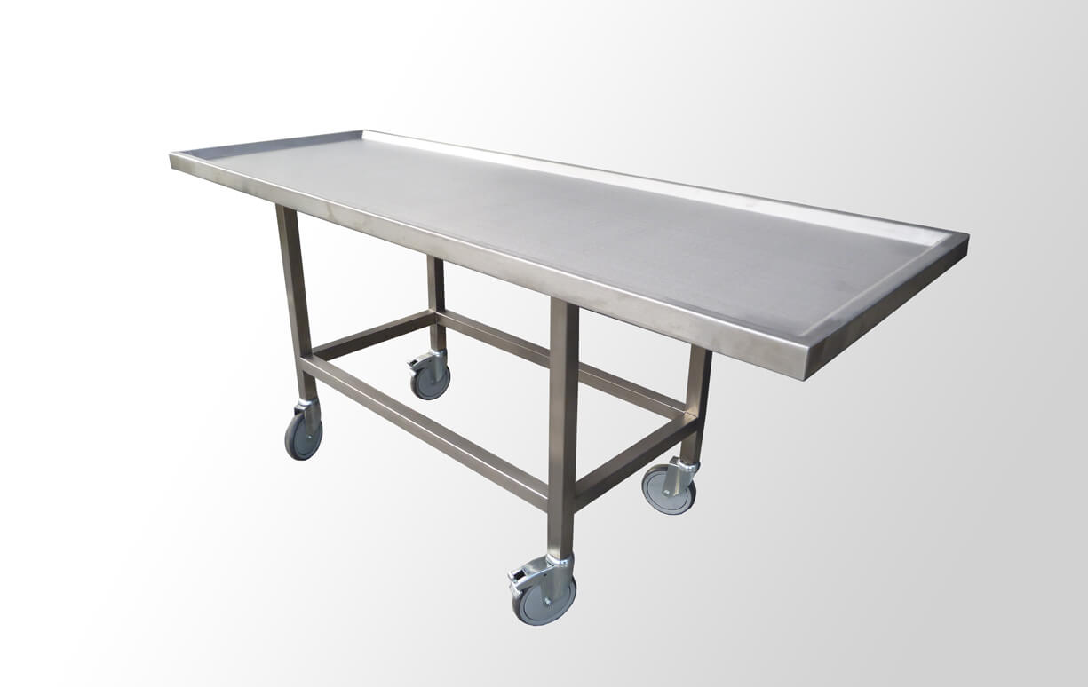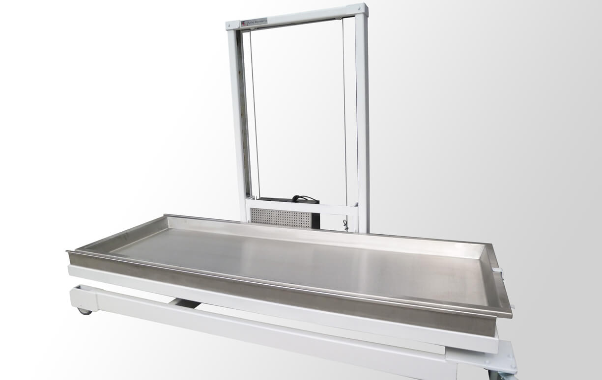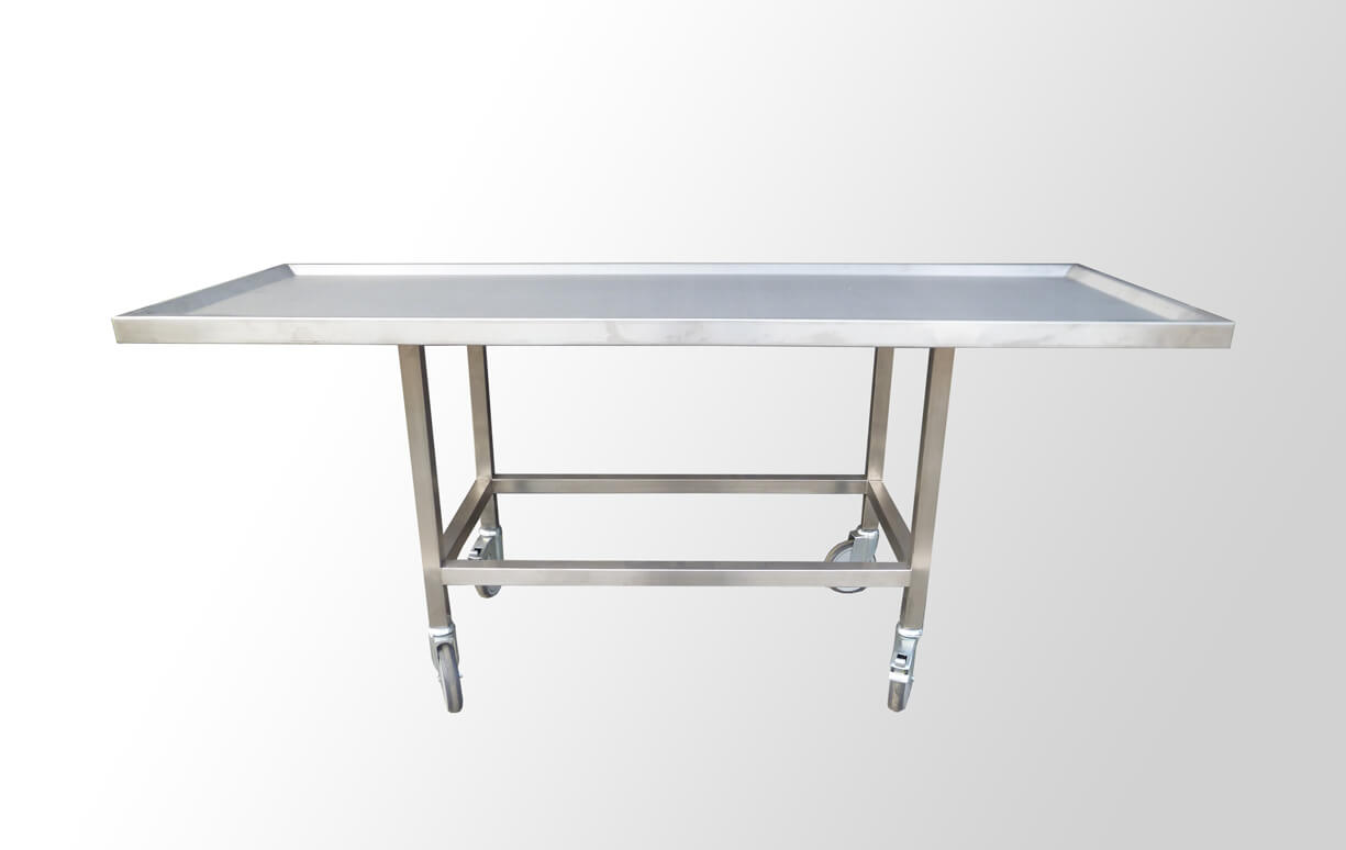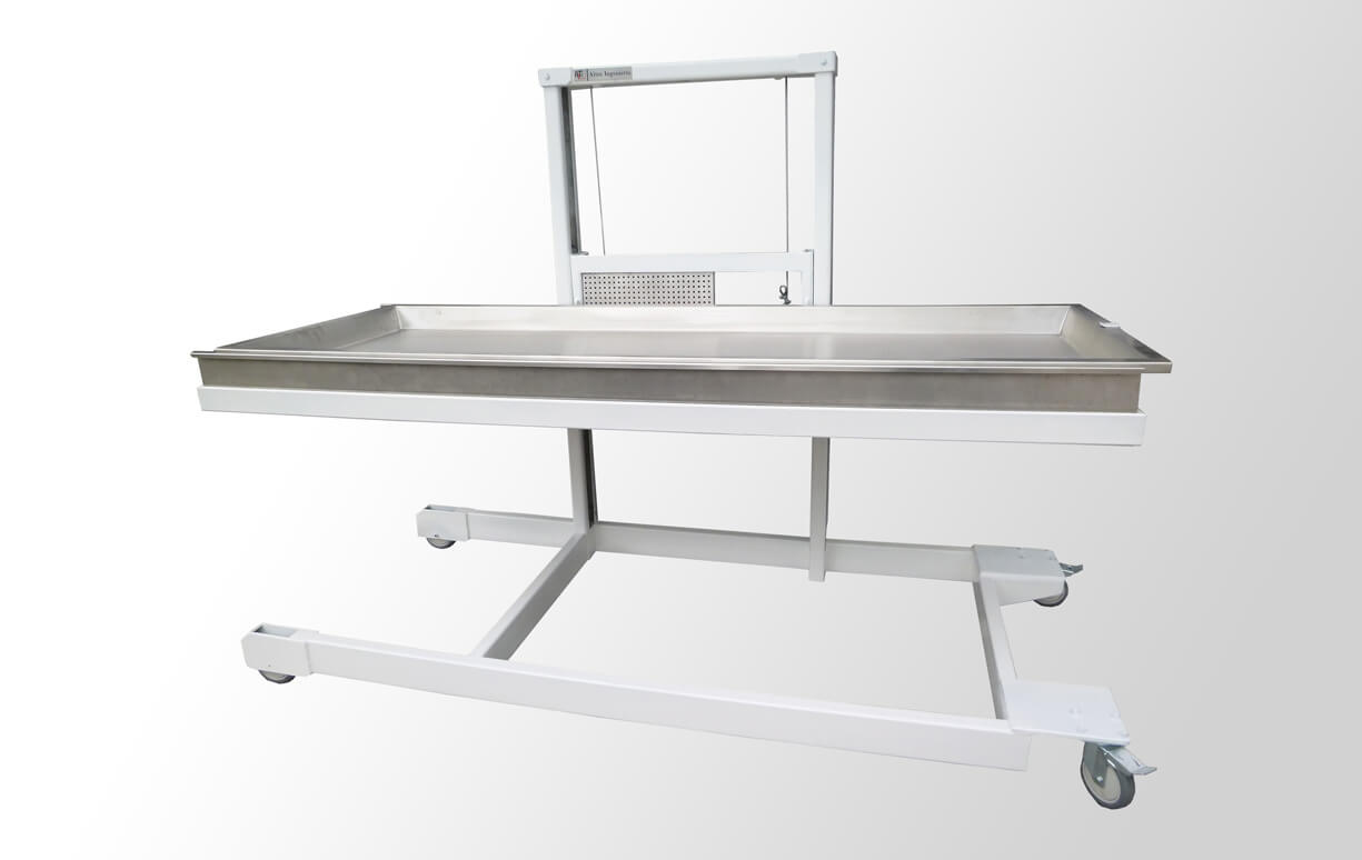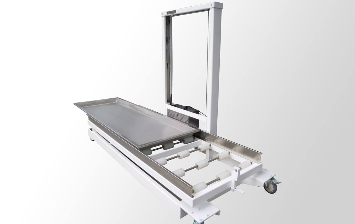 Carro elevador rodante para cadáveres. Apto para el traslado, posicionamiento y elevación de óbitos en bandejas de acero inoxidable. Rodante. Con rodillos de polipropileno de giro libre para facilitar el traspaso. Elevación y descenso operable mediante joystick.